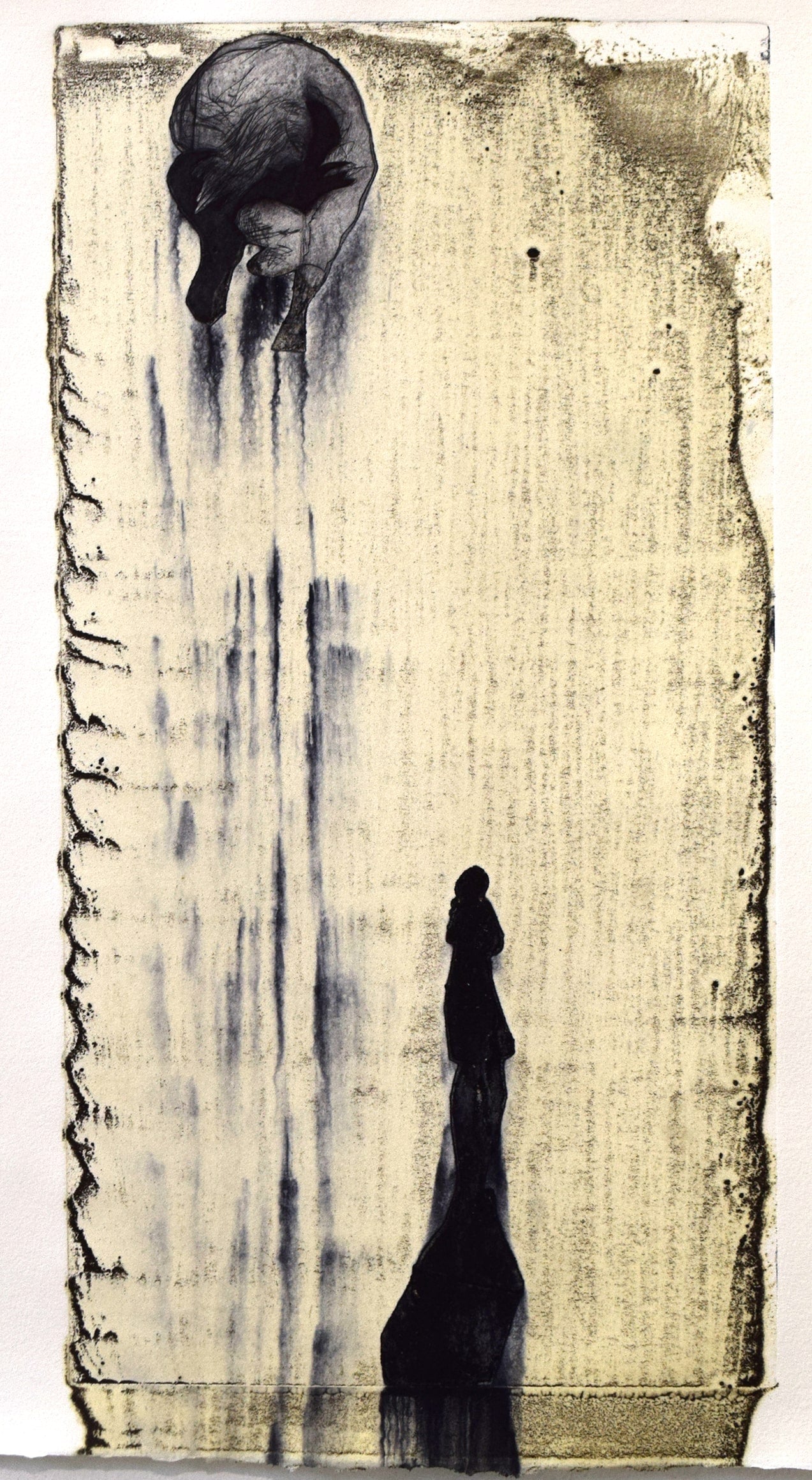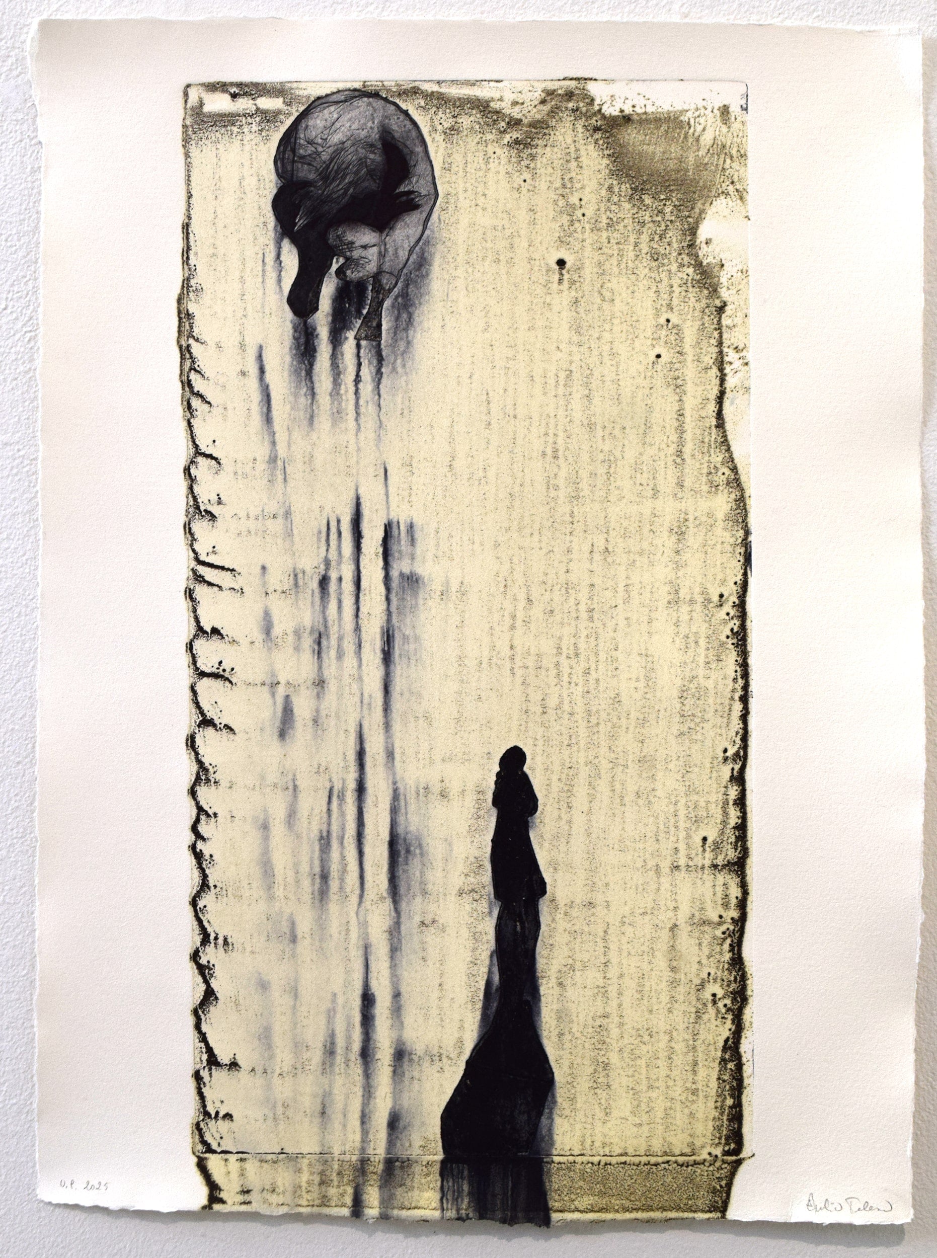 This work is part of Breathing Space, a series of conceptual, modular monotypes and drypoints on copper in which Telese uses glacier dust collected from extreme Icelandic dust storms by pioneer dust scientist Dr. Pavla Dagsson-Waldhauserová from the Agricultural University of Iceland. Embedded within the works are fragments of the scientist’s own experience—stories of how the very dust she collects affects her breathing, her body and her mind. These narratives, shared with Telese during their ongoing collaboration, are made visible in the work as figures and traces emerging from the black dust-ink. Telese combines the volatile, ephemeral nature of dust with the enduring weight of traditional metal engraving, reflecting on the fragile balance between transience and permanence, and the complex relationship between humans and environmental forces.